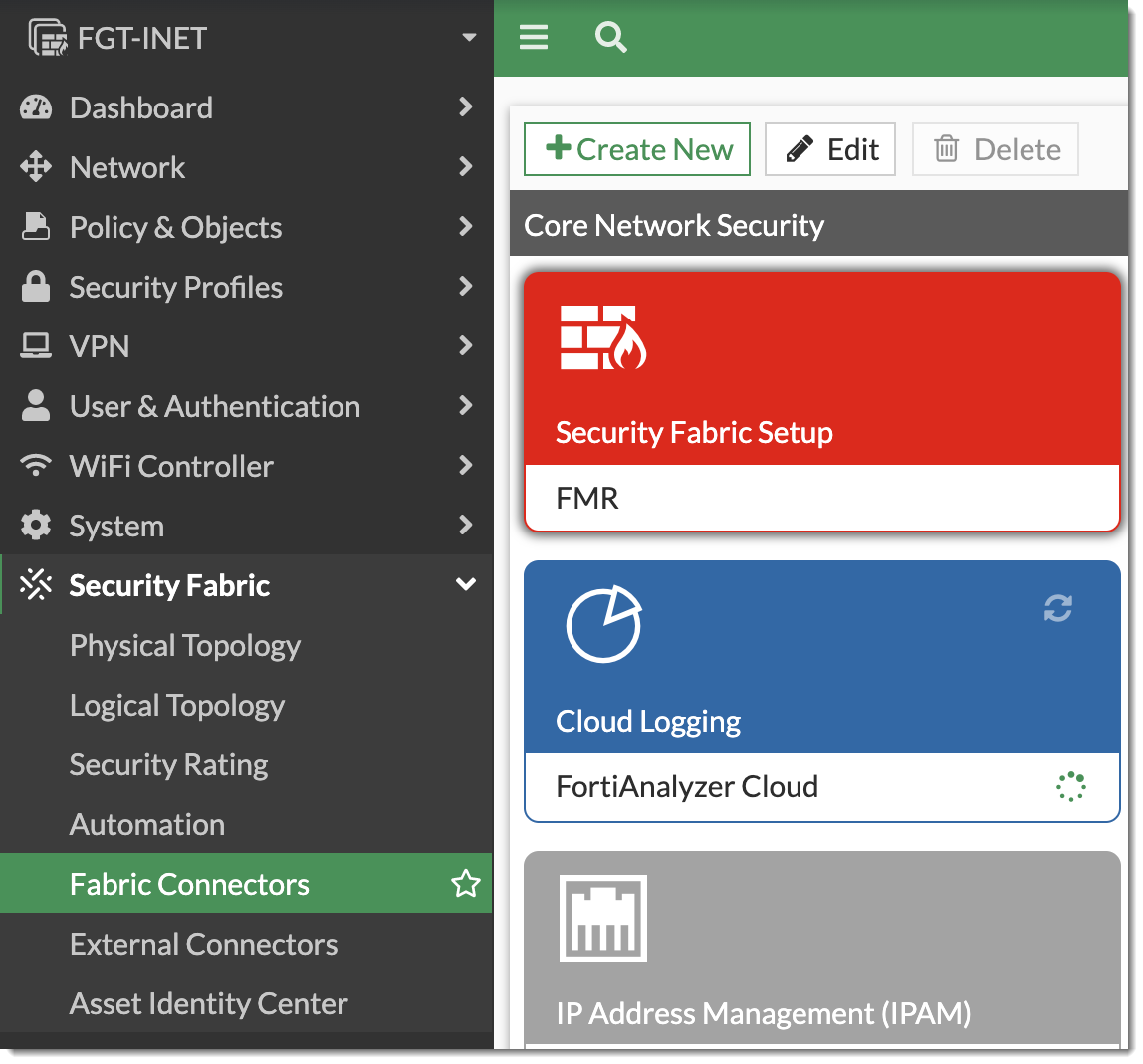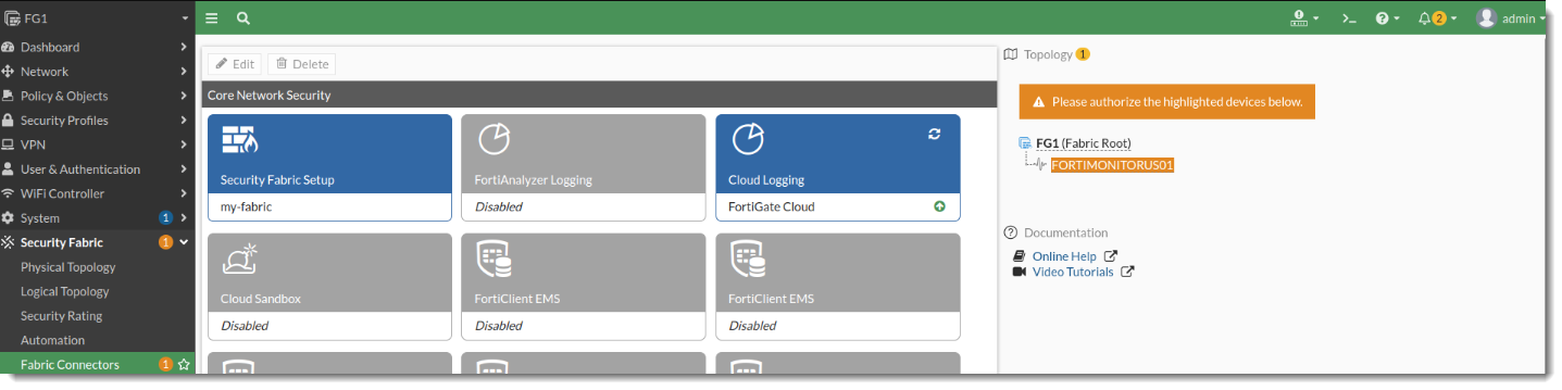 Note: Before connecting FortiMonitor to your Fabric environment, ensure that you have a fully functioning and active Security Fabric environment. Please see Prerequisites.