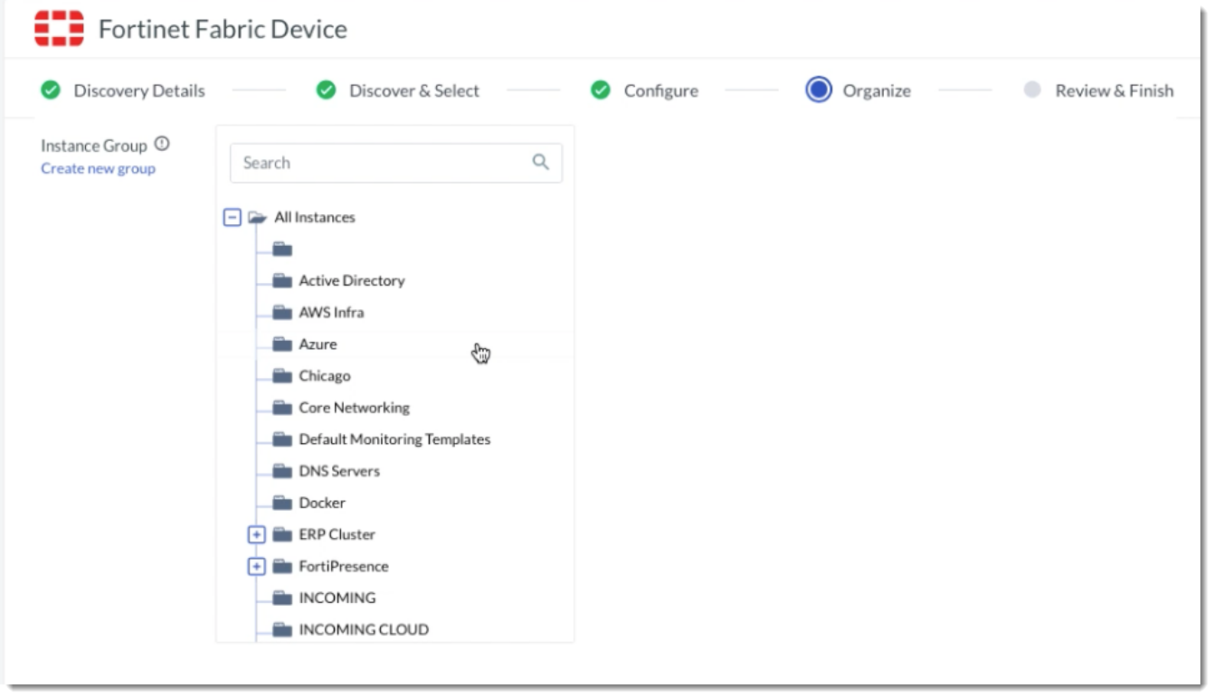 Next, configure the Instance Group, which is the logical organization of the monitored instances within FortiMonitor.