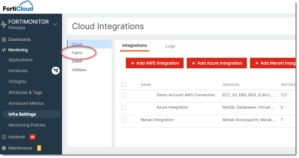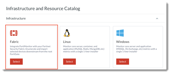 Important note: At this time, once a Fabric environment has been integrated with your FortiMonitor, it may not subsequently be integrated into another FortiMonitor account.