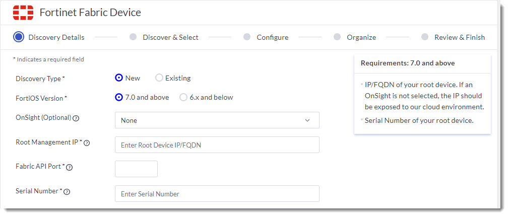 OnSight (Optional) - Select an OnSight. This OnSight will be used to monitor the FortiGates and associated devices. See Fabric 7.x OnSight proxy for more information.