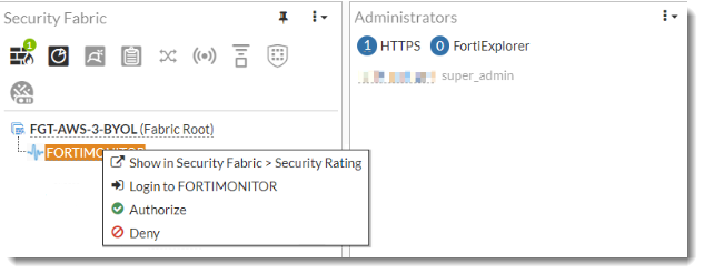 In the topology tree, click the highlighted FortiMonitor and select Authorize.