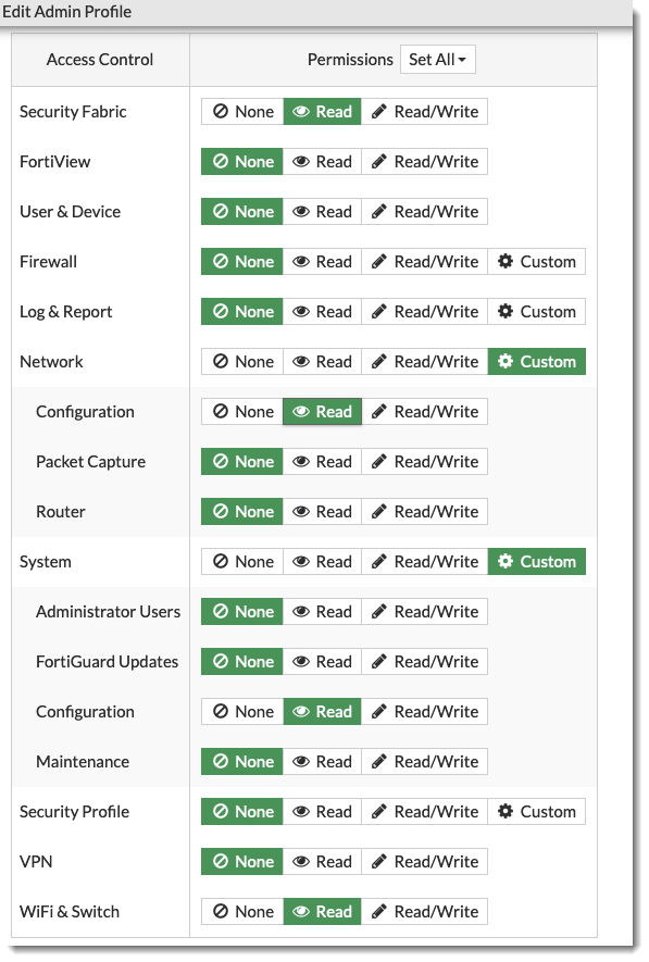Create an admin profile by going to System > Admin Profiles on the FortiGate. For example, fabric_admin_ro. It should have the following settings: