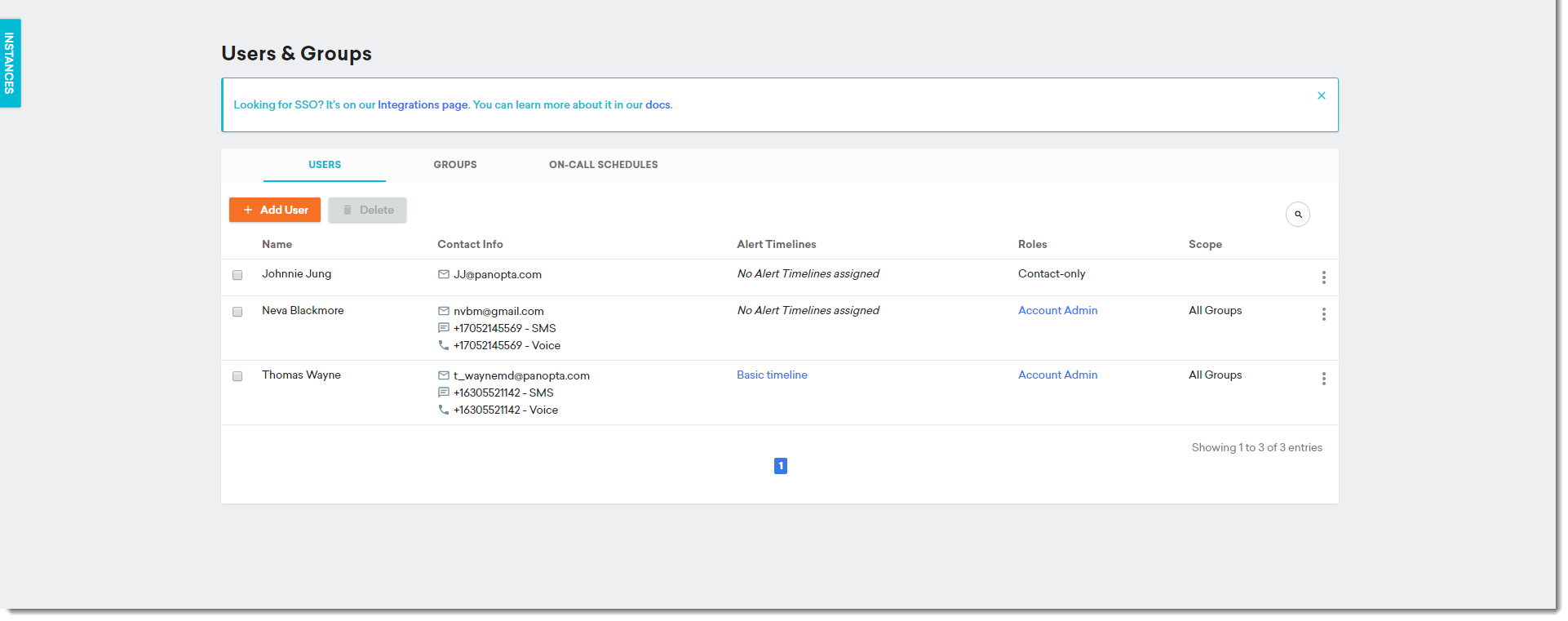 User accounts, groups, and on-call schedules in FortiMonitor are managed in the Users, Groups & On-Call page. You can use this page to add, edit, or delete users and groups to your FortiMonitor account.
