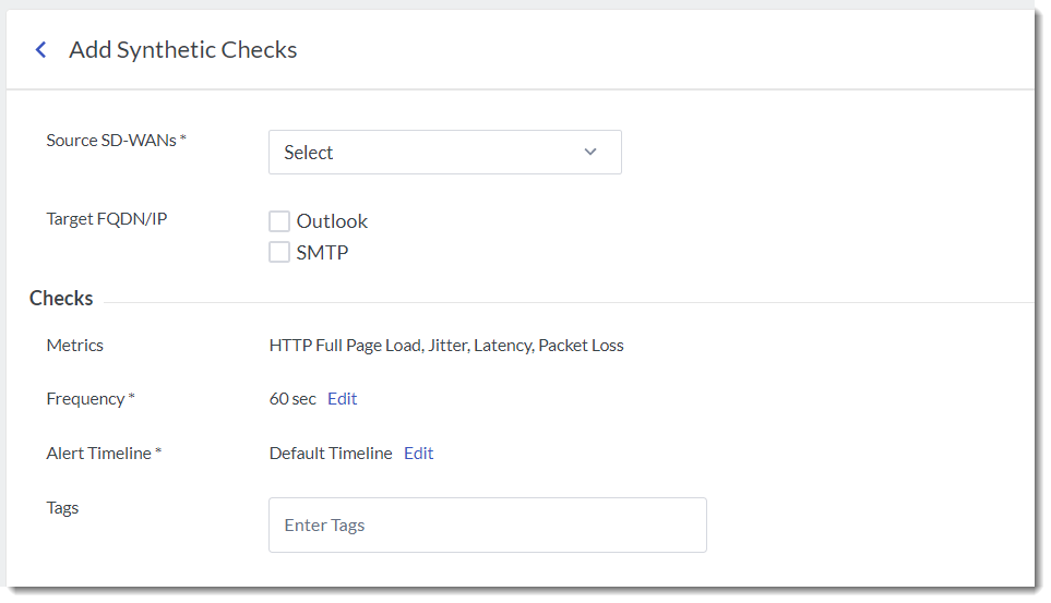 Select one or more Source SD-WANs and Target FQDNs/IPs. You also have the option to edit the check frequency and the Alert Timeline.
