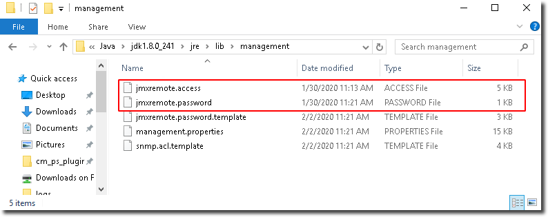 2. Create the jmxremote.access and jmxremote.password files in C:\Program files\Java\jdk1.8.0_241\jre\lib\management.