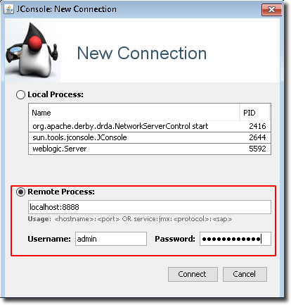 b. Select Remote Process then enter the <hostname>:<port>. Use the port configured while enabling JMX in setDomainEnv.cmd.