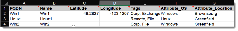 Attribute key-value pair. For more information, see Attributes. Add additional columns for attributes to the right of the column as needed. Populate the top cell of the column with the attribute key and the cells below with the attribute value for each instance. |