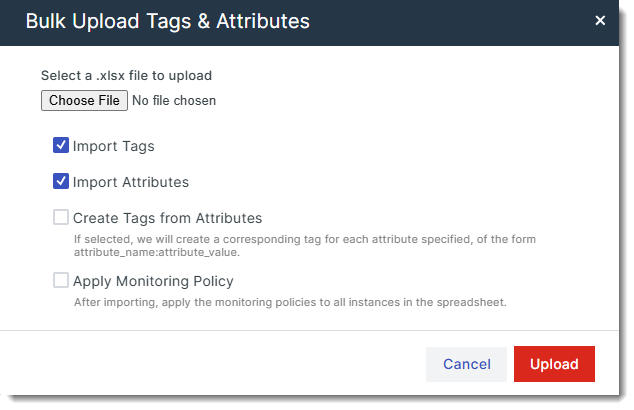 The Bulk Upload feature allows you to add tags and attributes to a large number of instances during or after the onboarding process. To do so, a template in XLSX format is available for download. You can use this template to assign tags, attributes, or both to your instances. After completing the template, you can upload the file directly to FortiMonitor.