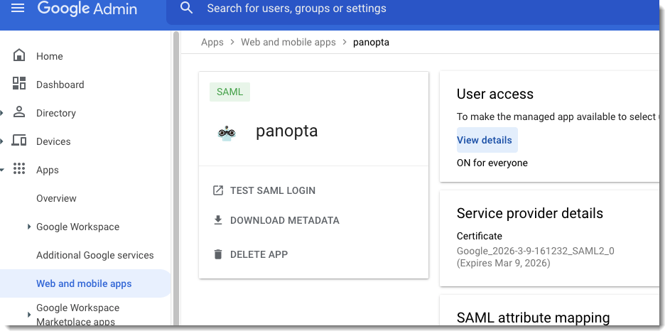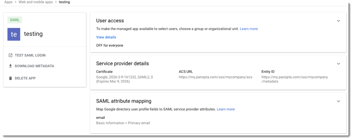 As you now view the SSO Setup, ensure that this integration is turned On for Everyone under User Access, or you can also allow for only a group within your organization. Visit the Google Learn More link for details. While testing, it is probably best to enable On for Everyone. Click the View Details link on the User Access pane to change this setting.