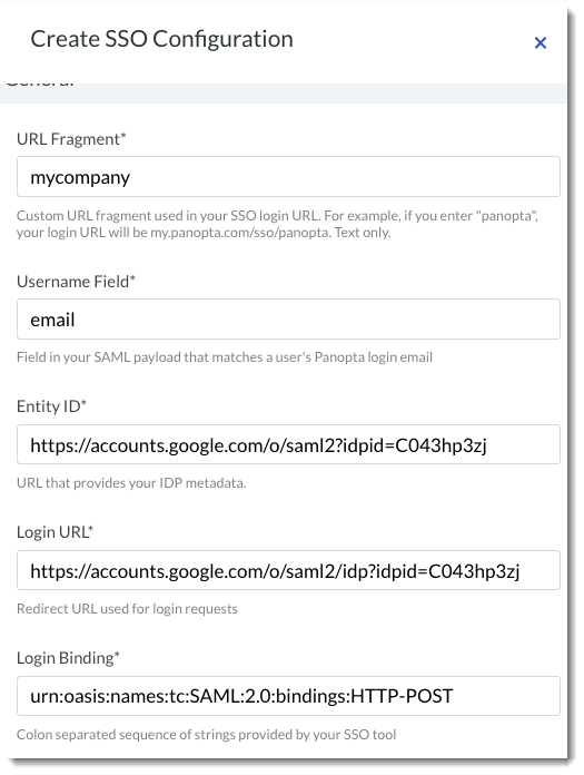 Note: All fields marked with an asterisk are required. Some of these you will copy over from the Google Admin panel. -