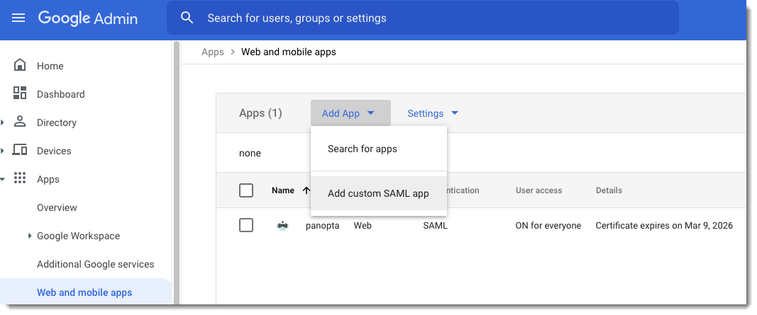 In the Google Workplace admin interface, go to Apps > Web and Mobile Apps > Add App > Add Custom SAML App as shown below: