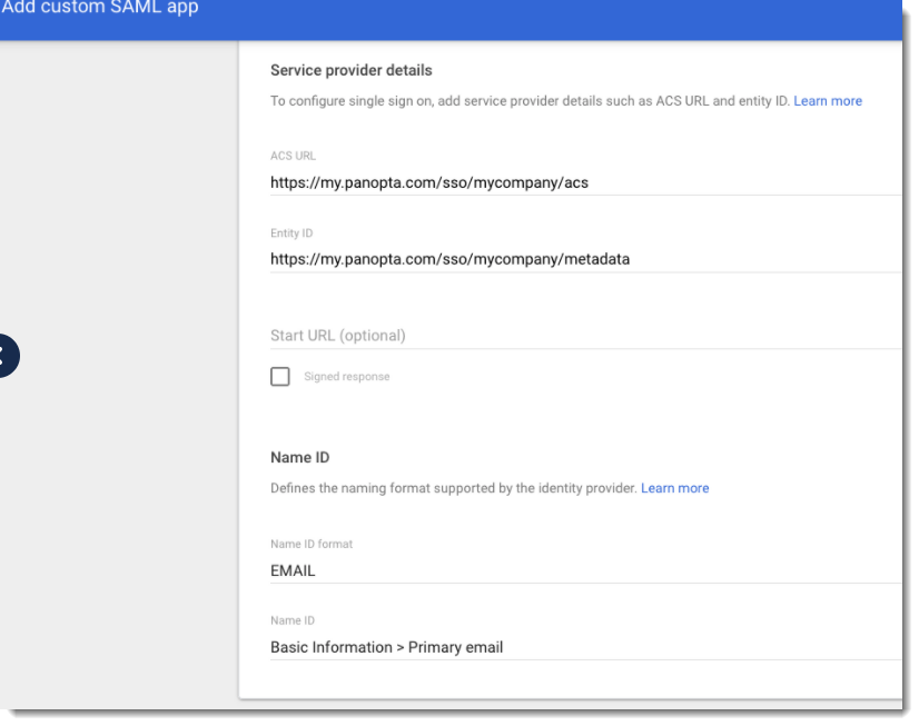 Back to the Google Admin Panel, and you can hit Continue to go the next screen. Here you will enter the following URLs, again using the example “mycompany”. Replace that string with your own choice for URL Fragment as discussed above.