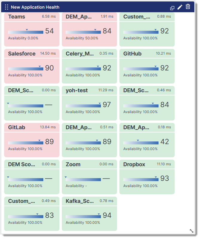 The Application Health widget is a single metric such as UX score, availability percentage, or average response time, that provides a summary of an application’s overall health.