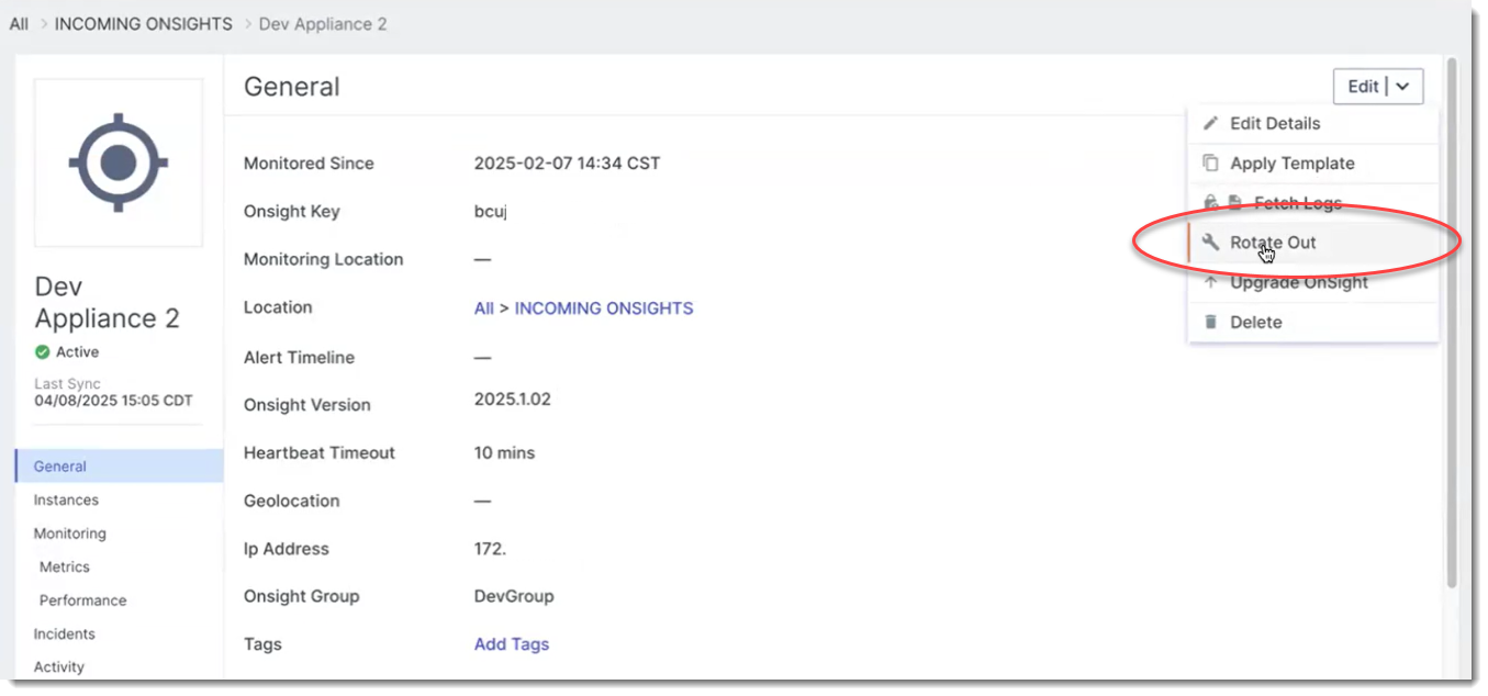 1. Navigate to the desired OnSight in the control panel and click the Rotate Out. Confirm the action by clicking I'm Sure.