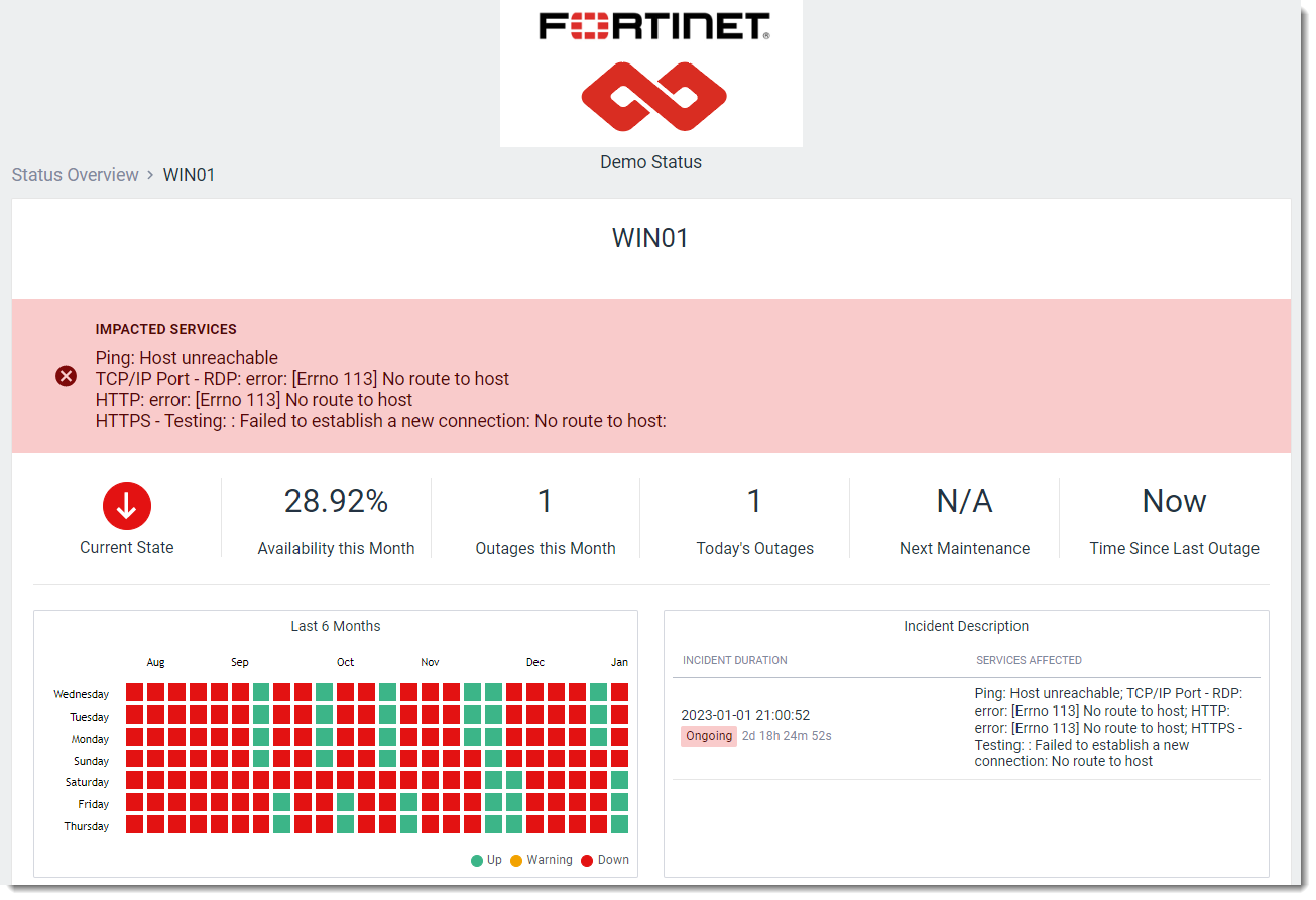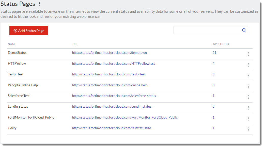 Our status reports were designed for just this purpose - they let you publish a publicly viewable page that lists the current status and availability for the servers FortiMonitor is monitoring. You can setup any number of status reports you desire, segmenting your servers into separate reports if desired.