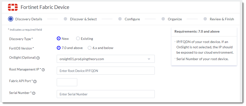 c. OnSight (Optional) - Select an OnSight. This OnSight will be used to monitor the FortiGates and associated devices. See OnSight vCollector for more information.