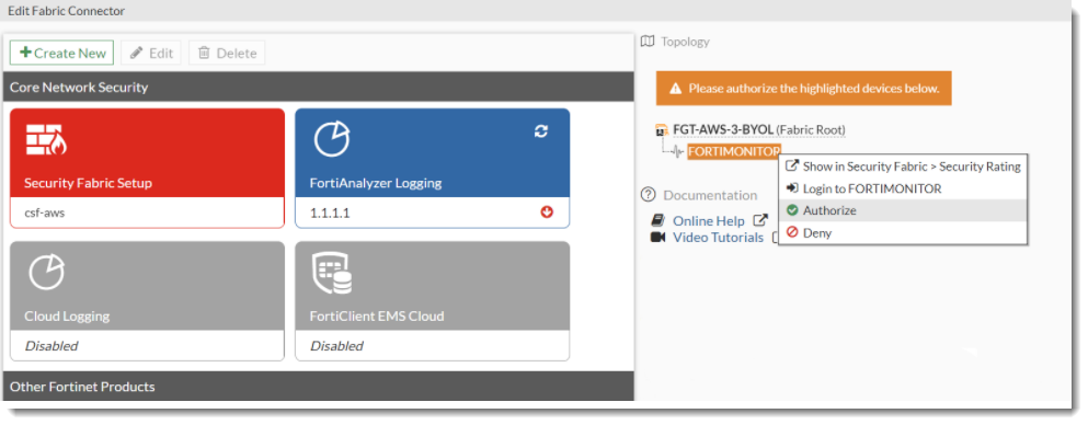 In the topology tree, click the highlighted FortiMonitor and select Authorize.
