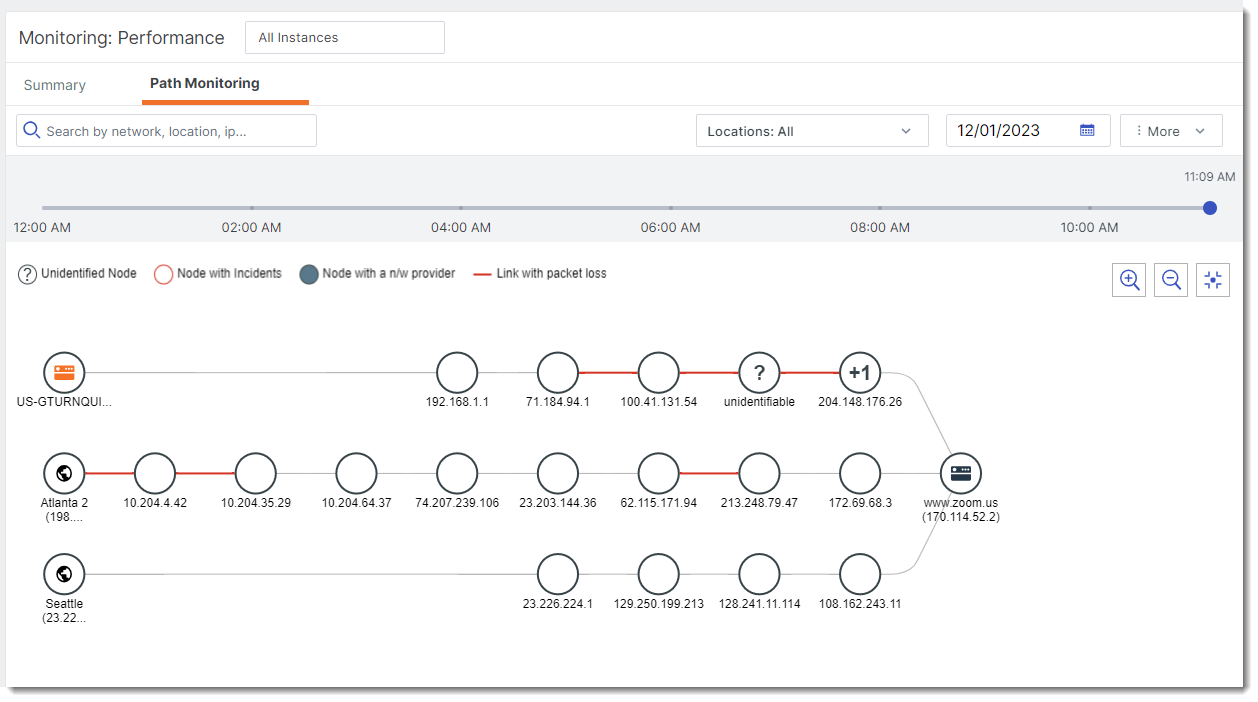 The path monitoring feature allows you to look into the reachability of target instances from one or more sources. The source can be OnSights, DEM Agents (MacOS and Windows), or public checkers. Path monitoring also features a timescale selector that allows you to see the results of a path recorded at any point in time.