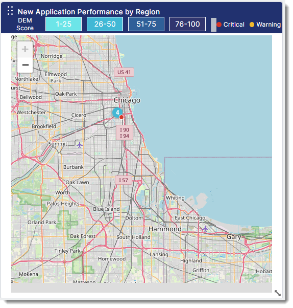 The Application Performance by Region widget shows the UX Score, availability, and incident information on a map view.