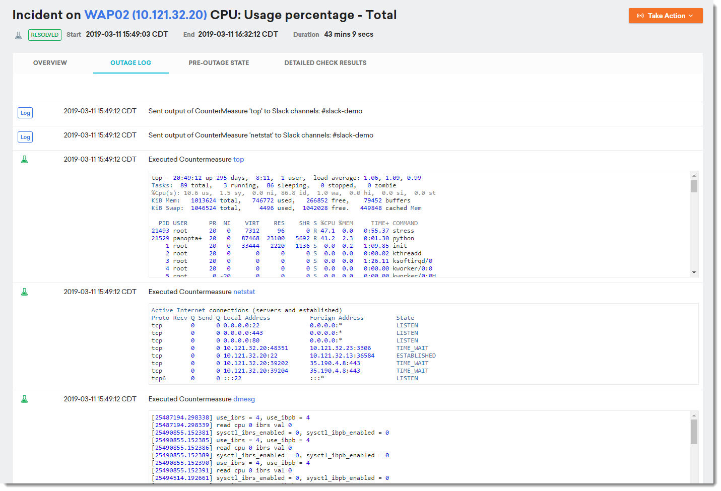 Any output provided by the CounterMeasure will be attached to the incident record and will be available in the FortiMonitor control panel, incident log, or Slack.