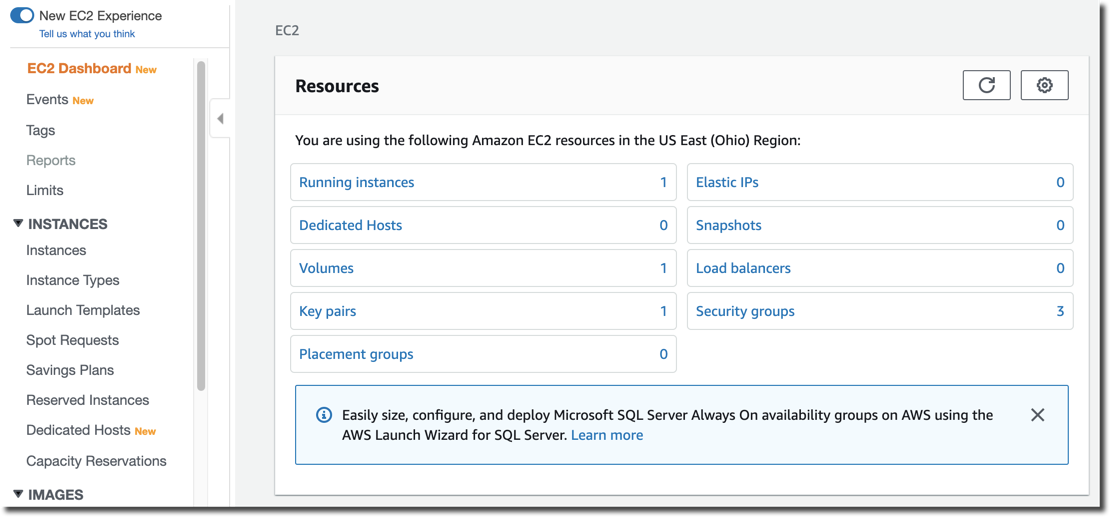 1. Log in to your AWS account and switch to the EC2 console by selecting EC2 from the splash screen or from under the Services navigation menu.