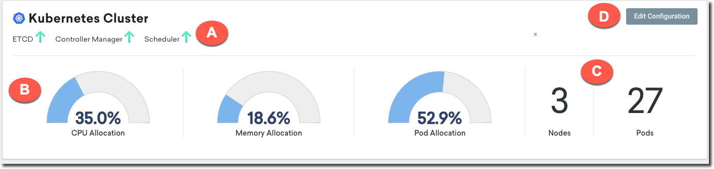 The Kubernetes cluster section of the details page shows the status of the components in the Kubernetes cluster. Gauges to measure resource allocation and the number of nodes and pods are also displayed. The section is described in the following table.
