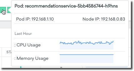 A green up arrow is displayed if there are no incidents detected in any of the pods or containers under the node. If an incident is detected, a red down arrow is displayed. |