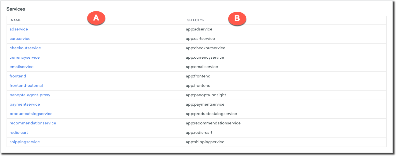 The Kubernetes services page lists all of the services running in the Kubernetes cluster. The section is detailed in the following table.