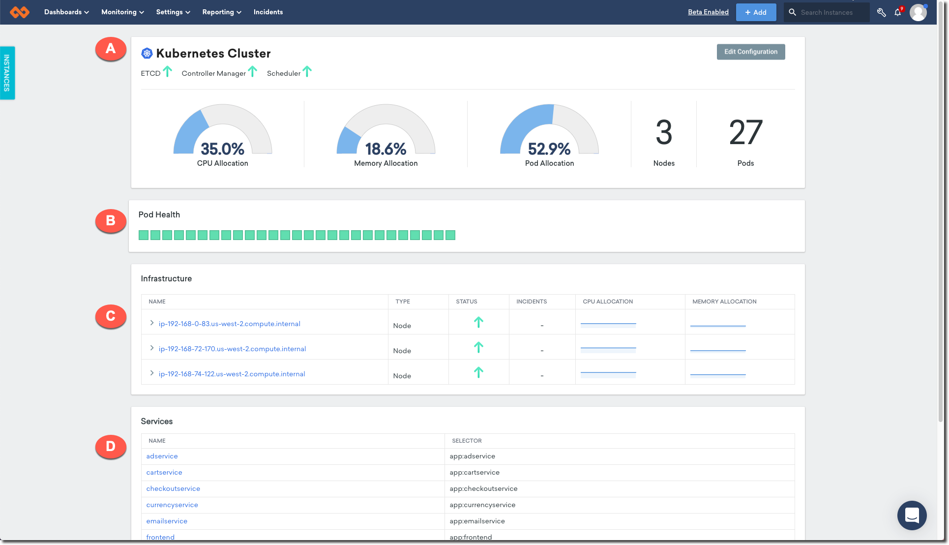 The Pod health section provides a high-level view of the health of the Kubernetes pods in your infrastructure. Pods are represented by green squares if there are no incident detected. Otherwise, the square becomes red.