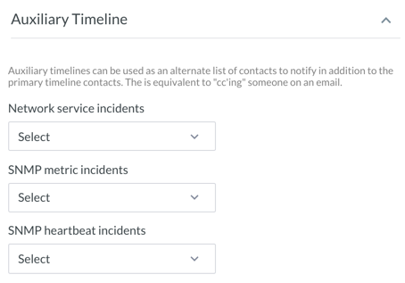 Auxiliary Timeline – Auxiliary timelines can be used as an alternate list of contacts to notify in addition to the primary timeline contacts. This is equivalent to copying someone on an email. Also, depending on the type of the instance, you can specify an alert timeline for each of the following incident types: