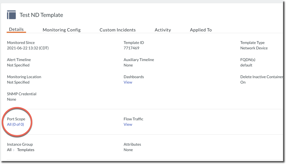 For network device templates, you can filter the number of ports that you can monitor using Port Scope. To configure the ports to be monitored, click the link below Port Scope.