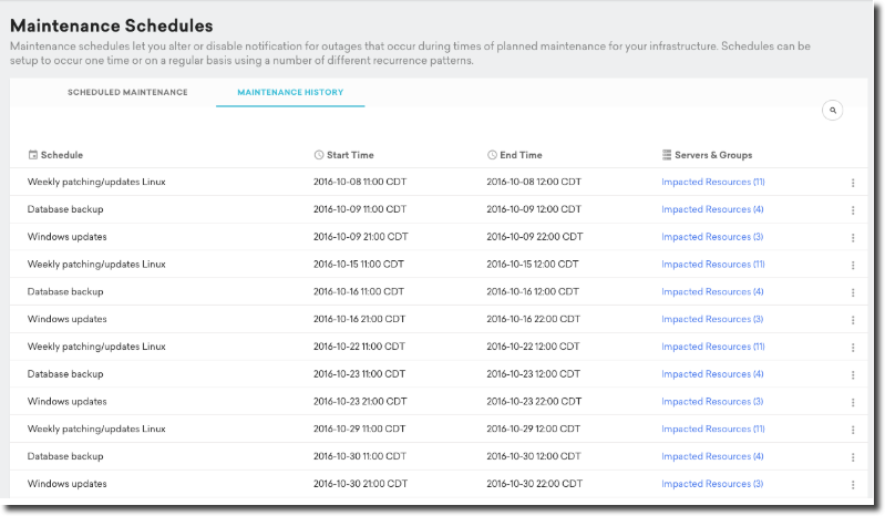 Your maintenance history is a very useful tool, after all you will need to be able to tell the difference between a planned and genuine outage. If you do not already know how to configure maintenance schedules, you may want to read this article. To access your maintenance history click on Monitoring and then “Maintenance Schedule,” then on the new page that opens up select the “Maintenance History” tab.
