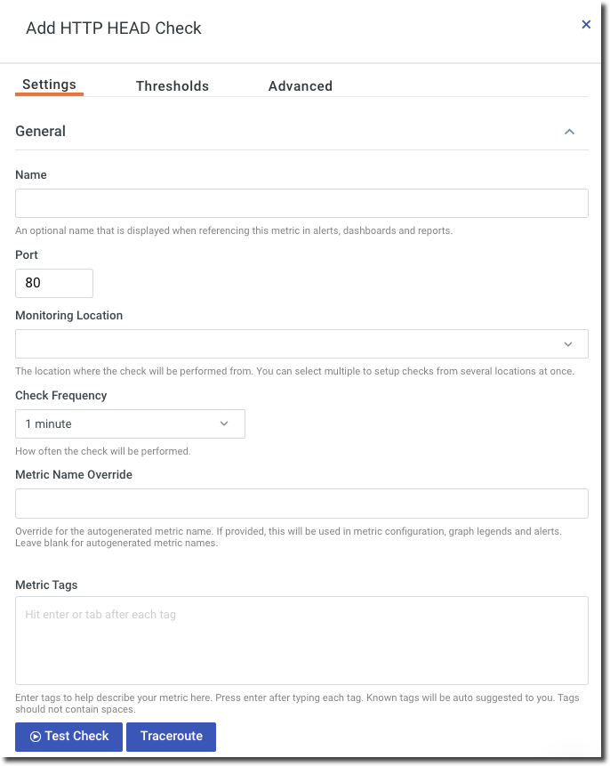 While the HTTP Port check tests if a port is reachable, the HTTP HEAD check tests if a HEAD request will return its appropriate response. A HEAD request is used to ask only for information about the page and not the whole page itself. This can be useful if you do not want to use up your servers' bandwidth or use unnecessary resources. If the HTTP HEAD check results in a 200 or a 300 status code, then the service is considered up, if it results in a 4xx or a 5xx, then the service is considered down.