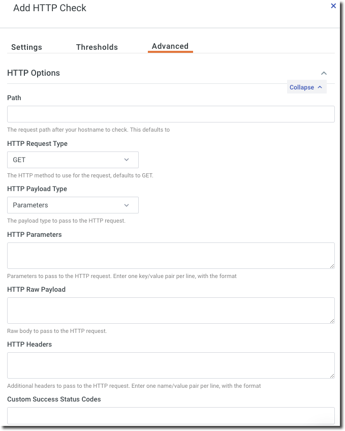 The HTTP Options module of the Advanced tab lets you add a specific path to check.