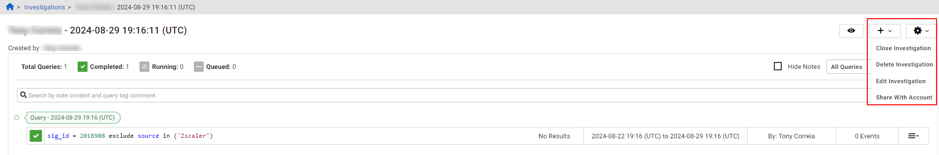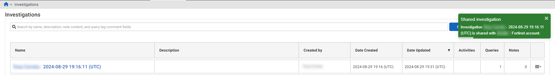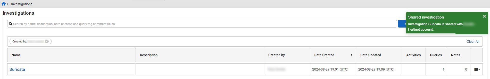 - Locate an investigation in your primary account. Investigations in your primary account are indicated with an account badge.