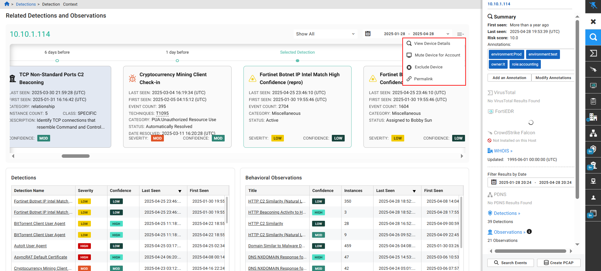 The Detections Context page allows you to view detections and observations for a device within a specified time range, and provides detailed insights that includes a timeline, detections, and behavioral observations tables. You can use this page to filter, mute, or exclude devices, and navigate to detailed information pages.