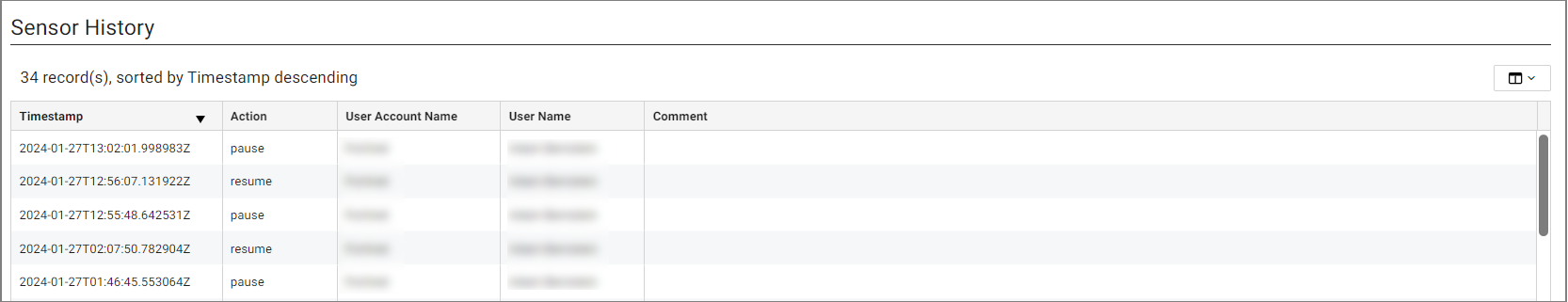 The Sensor History table shows the actions performed (paused or resumed), the user who initiated the action, well as any comments from the user. The table is sorted in descending order by timestamp. A message appears if there is no history to display.