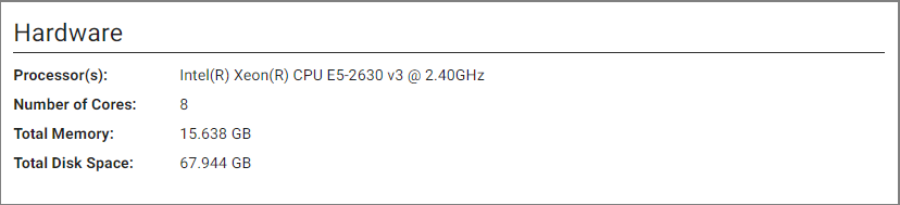 The Hardware pane displays the sensor Processor(s), Number of Cores, Total Memory and Total Disk Space.