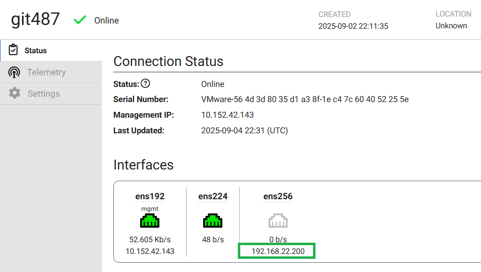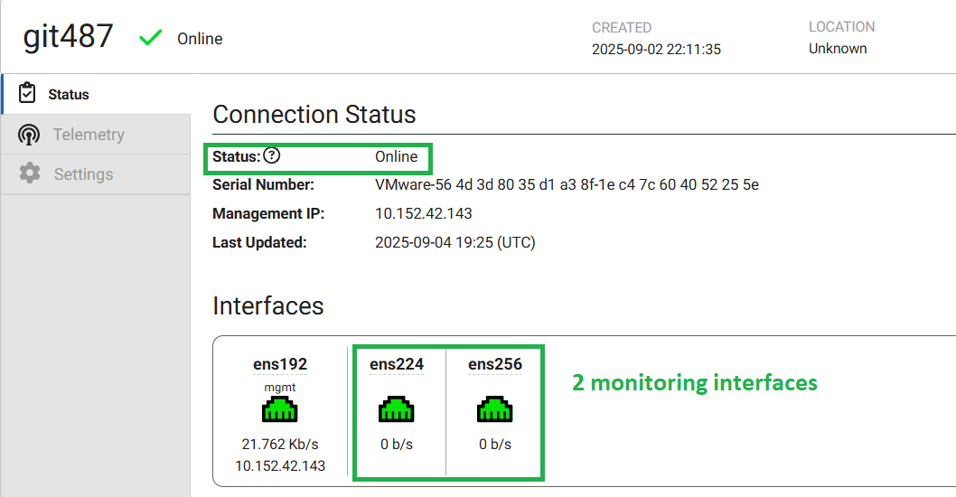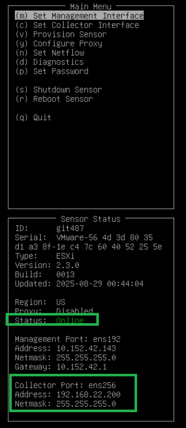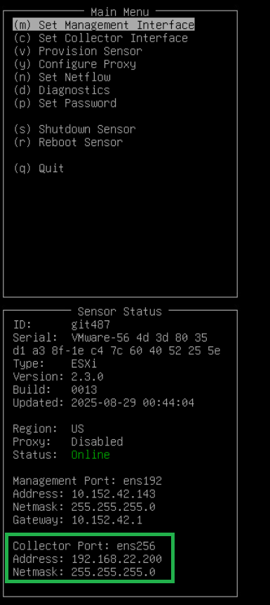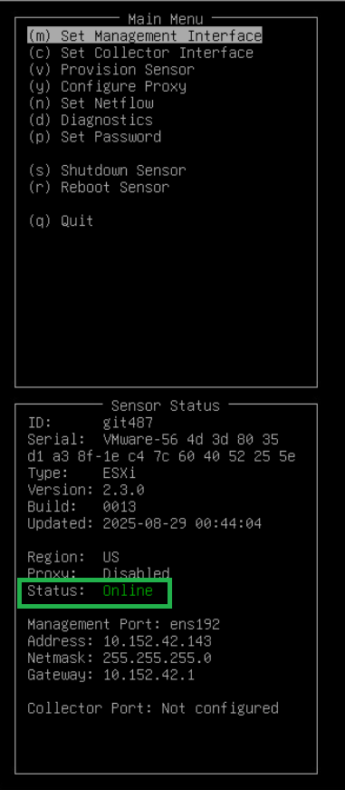The collector IP address will now appear in the TUI. Allow a few minutes for the sensor to update its status to Online.