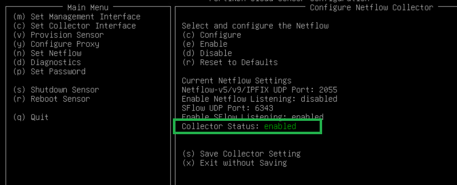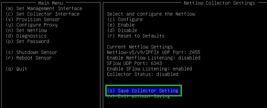 c), adjust the port or listening status, and select Submit. - The menu will redirect back to the Set Netflow menu. To save changes, select Save Collector Setting (press