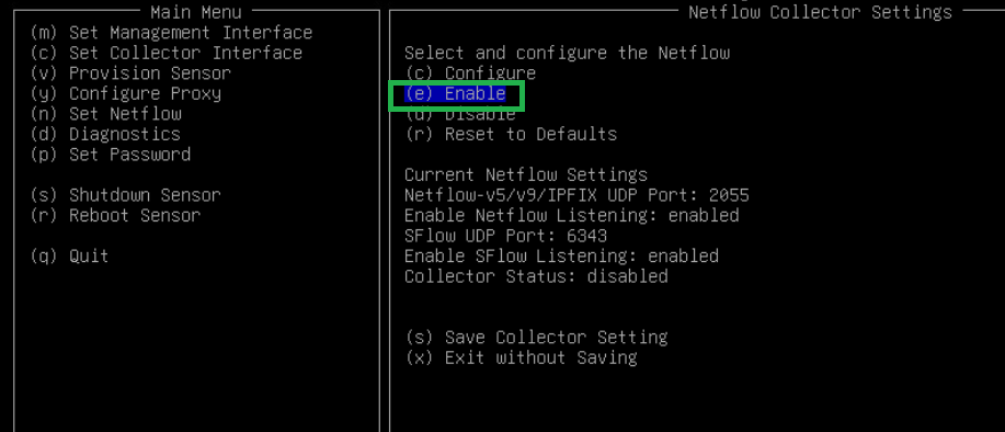 Important: The first time NetFlow is enabled, a full sensor reboot may be required. Select Reboot Sensor (press r) to reboot. Select Yes to proceed with the reboot
