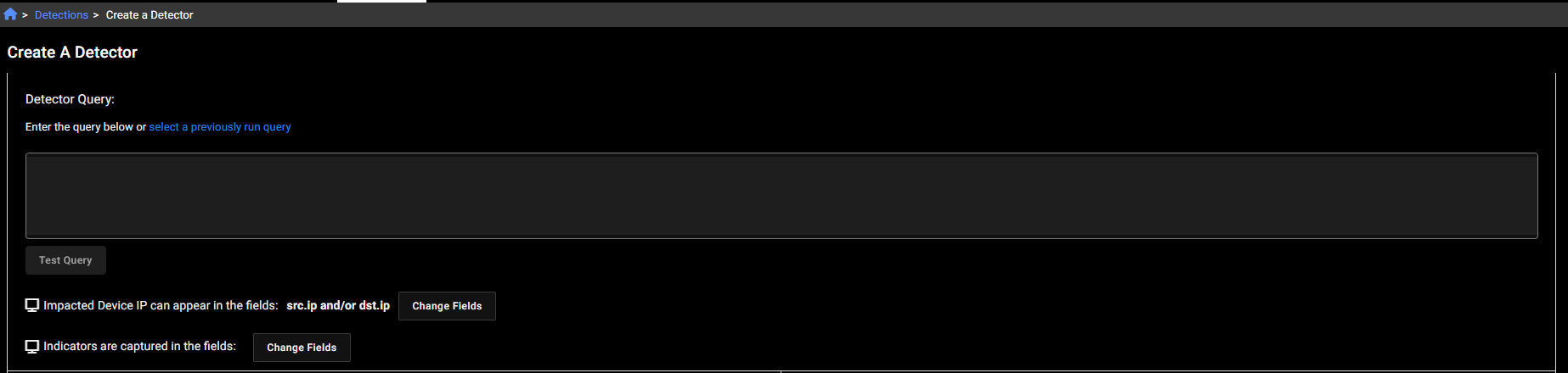 You can now create a new detector with a new query. In the Create Detector page, either enter a new query in the text field or click select a previously run query, to use a saved or existing query. If you enter a new query or edit an existing one, you are required to click Test Query and resolve any errors before you can save it.