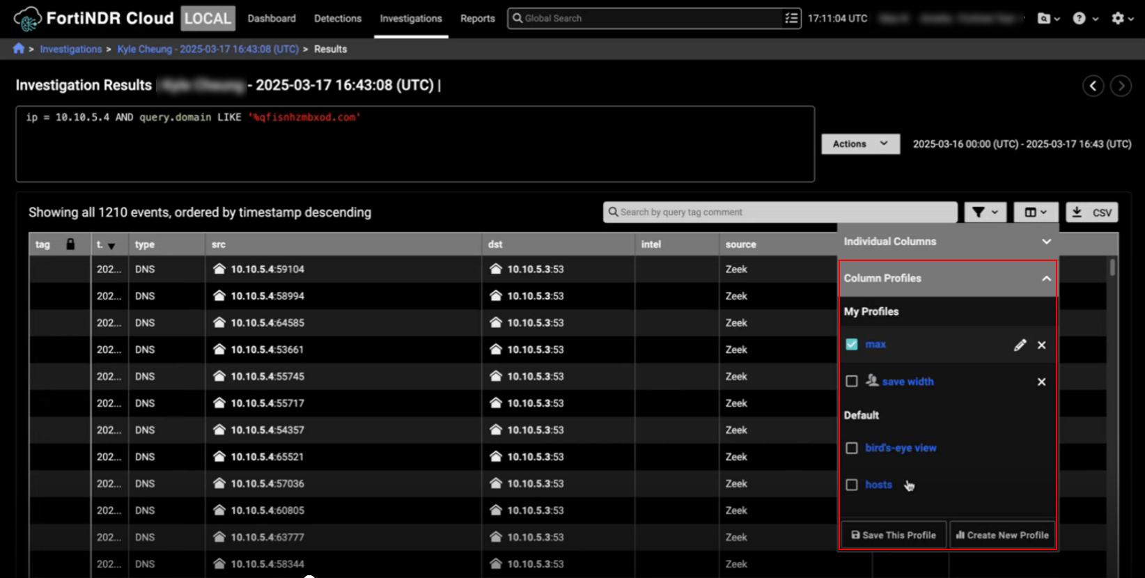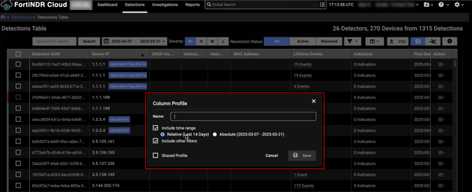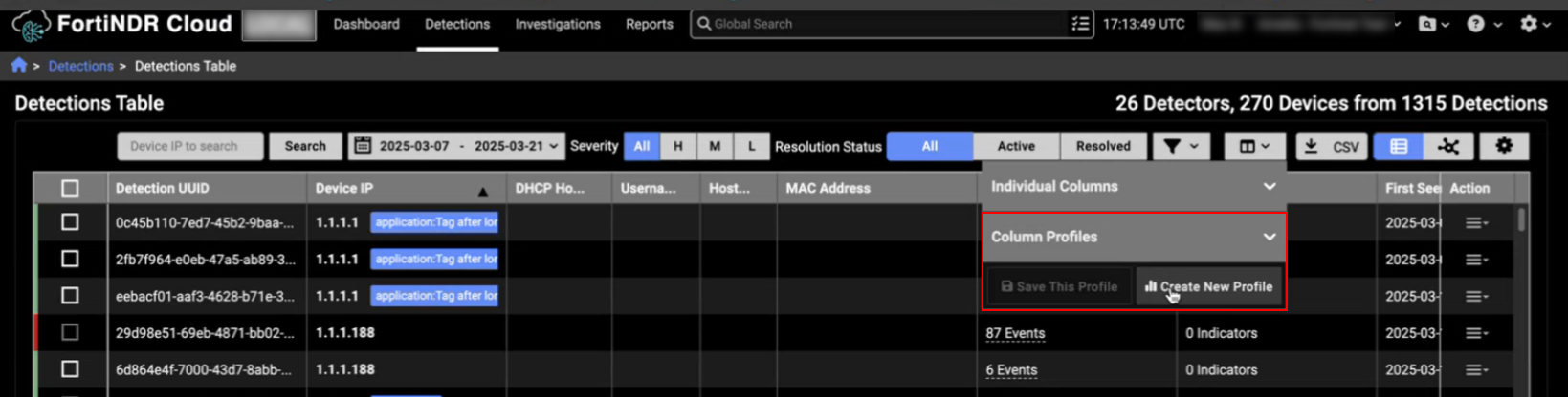 You can also create a new column profile from the Individual Columns menu in the Detections Table that will include the filters you applied to the page.