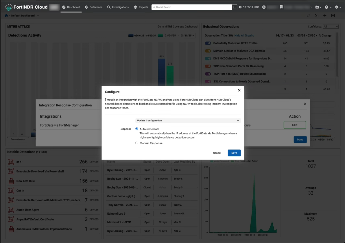 The new Response Configuration feature allows you to automatically ban an IP address when a high-severity and high-confidence detection occurs. This feature is only available for FortiGate via FortiManager integrations at this time.