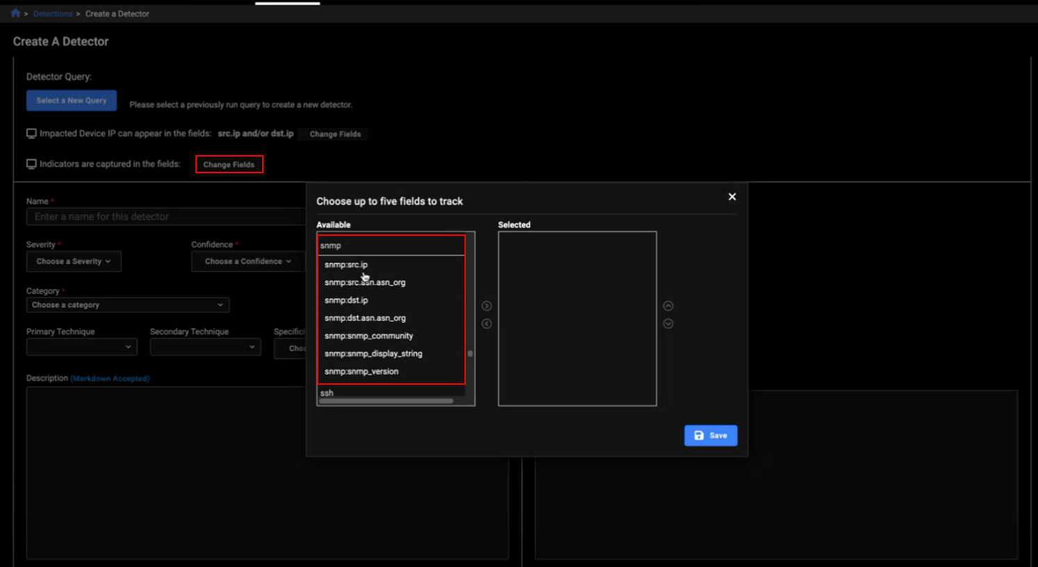 SNMP event fields were added to the Change Fields option when creating and editing a Detector. Any SNMP detections will appear in its own column in the Detector's Indicators tab.