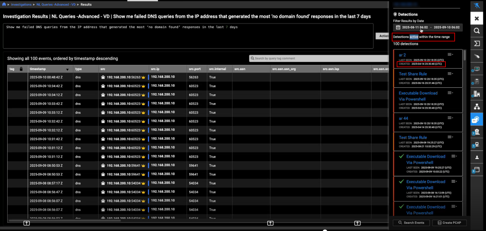The Detections tab in the Entity Panel now displays the Active detections within the time range. In previous versions, it displayed detections triggered within the time range. In the detection details, we have replaced Account with the Created date.