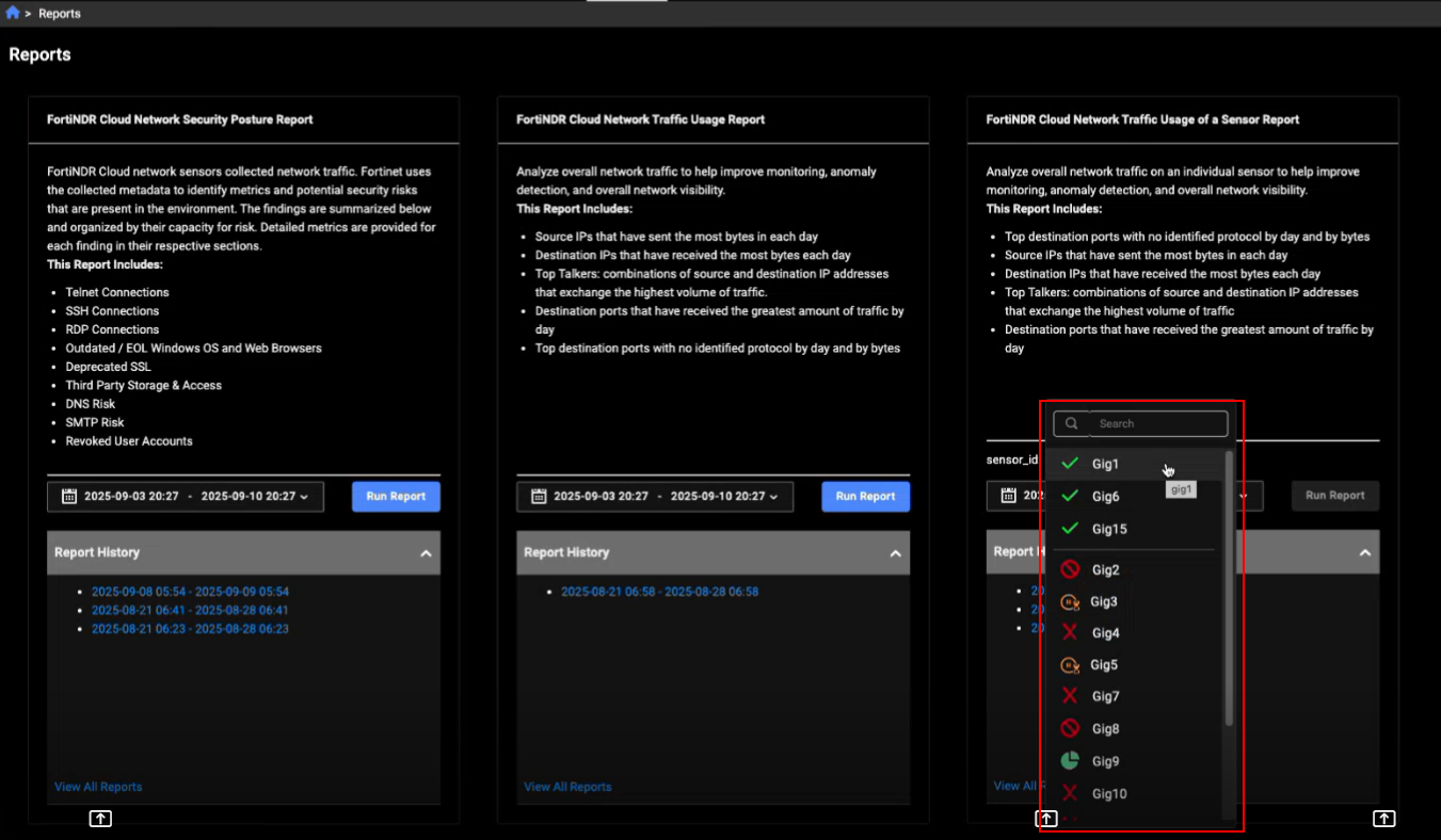 We’ve updated the sensor_id filter in the FortiNDR Cloud Network Traffic Usage of a Sensor Report and Detections list page to a dropdown menu that displays all sensors in the account. The dropdown is divided into two groups: online sensors appear at the top, while other statuses are listed below. Retrieving the list of sensors may take a few moments. During this time, a spinner will appear to indicate that the request is in progress.