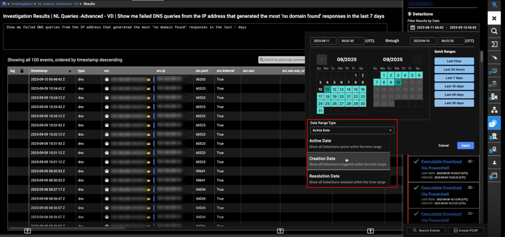 You can also choose the Date Range Type (Active Date, Creation Date, or Resolution Date) when selecting the time range in the date picker. This update is applied to Entity Panel throughout the portal.