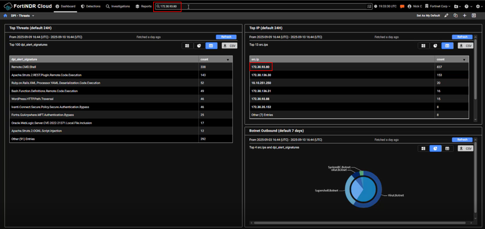 | Botnet from internal | This monitor identifies outbound botnet-related DPI alerts where the source IP is internal. It groups the results by both the internal source IP and the specific botnet signature that was triggered, helping pinpoint which internal hosts are attempting to communicate with known botnets. |