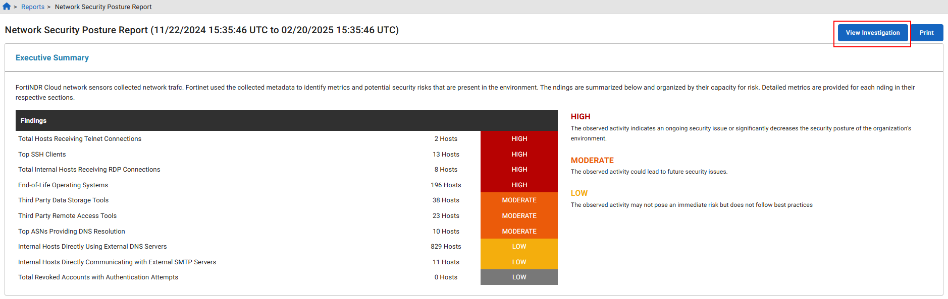 In the Investigations page, you can use the Report filter to search for FortiNDR Cloud Network Security Posture Report investigations.